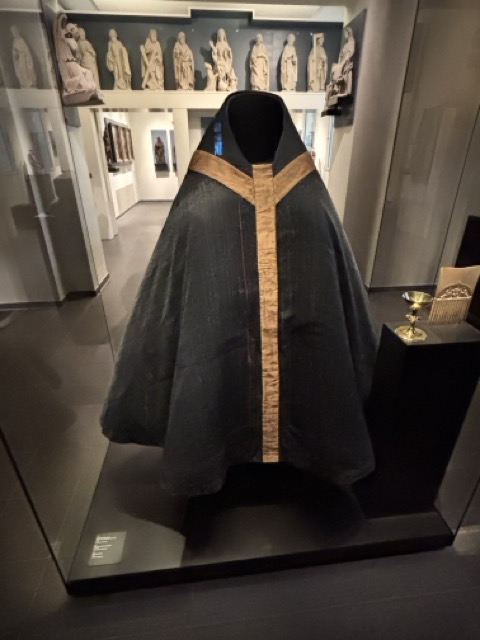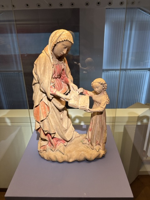 “Hello from Germany…During weekends I’ve been visiting a lot of medieval churches and museums. Thought you might enjoy this 1000-year-old bishop’s chasuble from the cathedral treasury of Osnabrück. The other photo is a lovely carving of St. Anne teaching the Virgin Mary to read as a little girl, from about 1400 (Paderborn Diocesan Museum) – the Christian tradition has always emphasized the spiritual authority and education of women, even if only patchily! – Duncan Hardy”